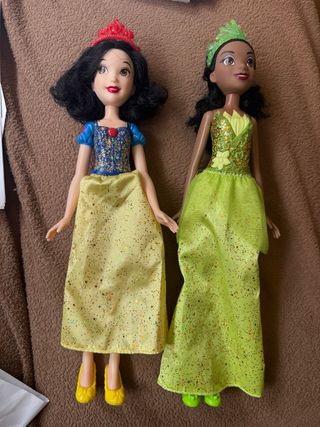 Set di 5 bambole Principesse Disney e Barbie, con abiti Barbie utilizzabili da tutte le bambole. Tutte hanno i loro vestiti originali. Ci sono scarpe per tutte tranne che per Ariel e includo tutti i pezzi singoli che ho e alcuni di Kent. Tutti i vestiti sono appena lavati. Nessuna ha la sua acconciatura originale e a Tiana bisognerebbe fare una crocchia perché di fabbrica ha i capelli appiccicosi e, anche se l'ho lavata con shampoo e maschera, non riesco a toglierli del tutto. Rapunzel ha la testa separata dal corpo, le altre non hanno nulla di rotto. Hanno giocato con loro e sono curate nonostante gli anni.