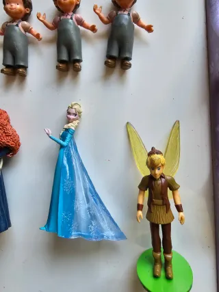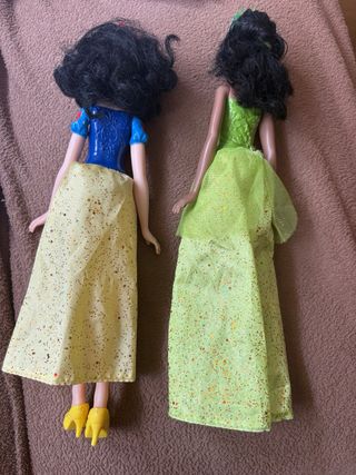 Set di bambole dei personaggi Disney. Una delle Frozen canta e ha la luce. Pulsante sui piedi e sul petto. Include due bambole di Elsa di Frozen (quella nella foto con il viso scolorito), una bambola di Biancaneve e una di Megara. Nessuna ha le scarpe.