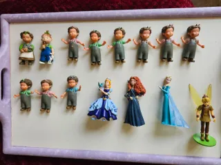 Set di figure di bambole e bambole. Figure di ragazzi e ragazze con abiti da giardiniere. Include personaggi Disney come Merida ed Elsa. Ci sono anche figure di fate.
