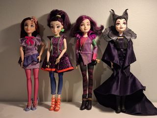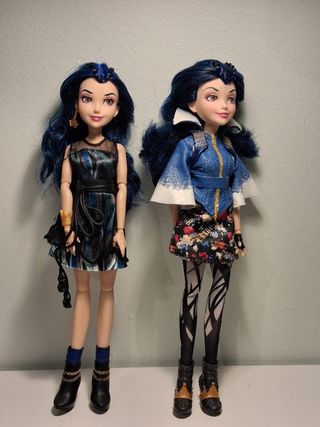 Confezione di due bambole del film Disney Descendants. Entrambe le bambole hanno i capelli blu scuro e arrivano con i loro abiti originali. - Bambola 1: Abito nero con dettagli argentati e blu, stivali neri con catene. - Bambola 2: Giacca blu con dettagli dorati, gonna stampata, calze con design.