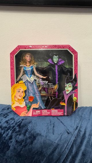 Set di bambole Disney Aurora e Malefica. - Bambola di Aurora con vestito blu. - Bambola di Malefica con mantello nero e viola. - Include arte dei personaggi nella scatola.
