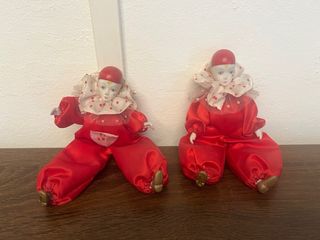 Deliziose bambole vintage in stile Pierrot, perfette per collezionisti. - Realizzate in ceramica e tessuto. - Abiti rossi con dettagli a cuore. - Espressione dolce e malinconica.