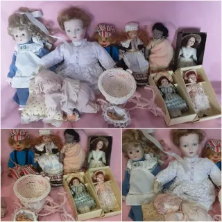 Lotteria di 12 bambole antiche, ognuna con il proprio fascino e stile, alcune da restaurare. Varietà di dimensioni e design. Pezzi da collezione. Ideali per gli amanti delle antichità. Sono di stoffa, cartone, porcellana e ceramica. Guarda le foto per un'idea delle dimensioni e della conservazione. Le foto possono essere inviate tramite WhatsApp per una migliore idea. Le spedizioni sono disponibili.