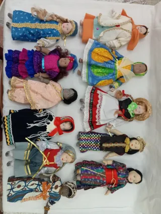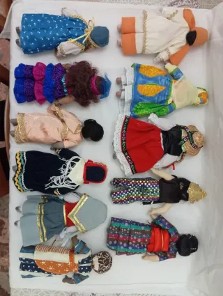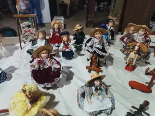 Set di quattro bambole con abiti tradizionali. - Altezza approssimativa di 25 cm ciascuna. - Abiti dettagliati con disegni folcloristici. - Ideali per collezionisti o decorazione. - Viso, braccia e gambe in ceramica. 1 unità: 2€ Pack di 4: 8€ Pack di 10: 18€ Tutte: Prezzo negoziabile