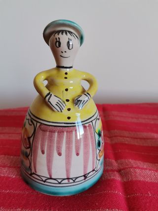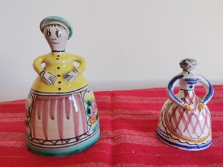 Set di due figure decorative in ceramica, dipinte a mano negli anni '70 con un design tradizionale. Le misure sono: la prima bambola 14 cm di altezza x 9 cm di larghezza e la seconda bambola 9 cm di altezza x 6 cm di larghezza. Possibilità di spedizione. Caratteristiche: Figure in stile campestre. Colori vivaci e dettagli dipinti. Base con bordo decorativo.