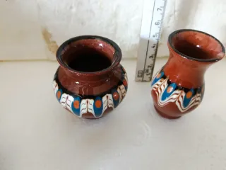 Set di due piccoli vasi in ceramica decorata, perfetti per arricchire presepi o case delle bambole. Guardare bene le foto uno dei due pezzi ha una leggera sbeccattura. Così evitiamo malintesi. - Vasi in terracotta con decorazioni colorate. - Design tradizionale.