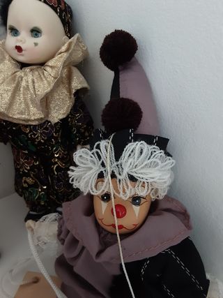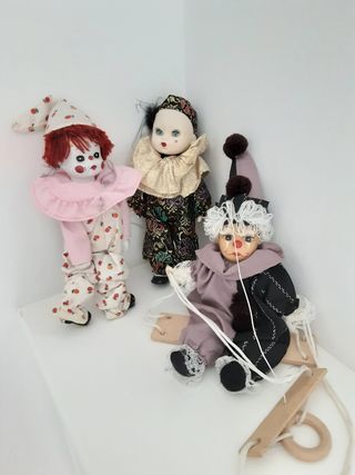 Set di 3 burattini a forma di clown, realizzati in ceramica. Sono in buone condizioni, perfetti per collezionisti o amanti del genere. Due in ceramica, di cui uno con la possibilità di essere appeso perché è su una altalena. Mentre il 3 è un Poirot in silicone. Altezza delle bambole 21cm