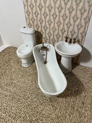 Set completo per bagno in miniatura, ideale per case delle bambole. Include water, vasca e lavandino. - Colore bianco con dettagli filo argento. - Materiale ceramica. Accessorio per casa delle bambole #dollshousefurniture #casadellebambole #mobiliinminiatura #maisondepoupee #meublespourmaisondepoupee #bambole #meublesenminiature #dollhouse #casademuñecas #dollhouseminiature #puppenhaus #miniatureinlegno #casitademunecas #miniature #poppenhuis #dollshouse #miniatureinlegno #modellismo # presepe #accessoripresepe