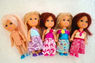 Set di 5 bambole Chloe Girlz con abiti colorati. - Bambola con capelli biondi e abito viola con fantasia. - Bambola con capelli castani e abito fucsia con fiore. - Bambola con capelli biondi e abito azzurro con fiore giallo. - Bambola con capelli castani e abito rosa con fantasia. - Bambola con capelli biondi senza abito. -Dimensioni compatte: circa 12 cm