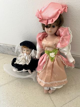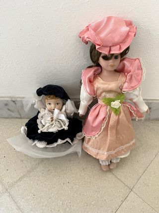 Due splendide bambole di porcellana vestite con abiti d'epoca. - Una bambola indossa un abito rosa satinato con dettagli in pizzo e un cappello coordinato. - L'altra bambola è vestita con un abito nero di velluto con dettagli in pizzo e un cappello nero. - Entrambe le bambole hanno un viso dettagliato e capelli castani.