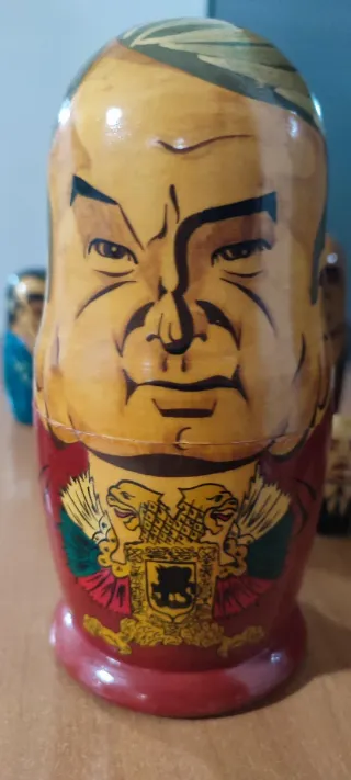 Set di matrioske russe dipinte a mano, raffiguranti personaggi storici. - Cinque bambole russe in ordine decrescente di grandezza. - Dettagli dipinti a mano su ogni bambola.