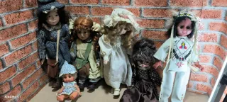Lotto composto da sei bambole vintage, ognuna con un abbigliamento e uno stile unico. Altezza 40 cm ,50 cm - Bambola con cappello a scacchi e borsa a tracolla. - Bambola con capelli rossi ricci e grembiule verde. - Bambola con cappello di pizzo e vestito bianco. - Bambola con occhiali e capelli scuri raccolti. - Bambola in abito indiano con copricapo. - Bambola neonata con cappellino e tutina.