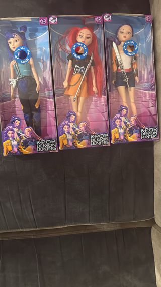 Set di 3 bambole K-Pop Demon Hunters. - Bambola con capelli blu e outfit viola/nero. - Bambola con capelli rossi e outfit nero/arancione. - Bambola con capelli viola e outfit arancione/blu.