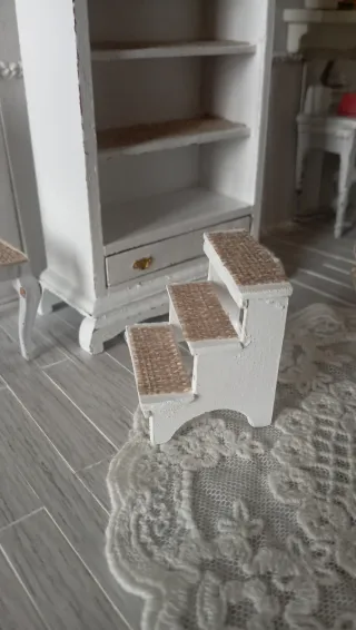 Incantevole scaletta decorativa a ripiani in miniatura (scala 1:12). Realizzata artigianalmente in legno bianco con finitura Shabby Chic invecchiata. Perfetta, aggiunge profondità e realismo a ogni ambiente della tua casa delle bambole o diorama. Un pezzo versatile e ricercato per collezionisti che amano il dettaglio romantico e lo stile provenzale. Alta qualità fatta a mano. (Vedi profilo per mobili coordinati). #dollhouse #miniaturas #shabbychic #estanteria #escalera #casitademuñecas #mueblesmuñecas #miniature112 #vintage #handmade #hechoamano #casadellebambole