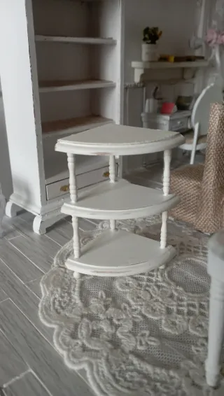 Elegante mobiletto angolare (angoliera) in miniatura scala 1:12. Realizzato in legno bianco con finitura decapata stile Shabby Chic. Dispone di tre ripiani. Perfetto per arredare gli angoli del salotto o della camera da letto nella tua casa delle bambole, aggiungendo un tocco romantico e provenzale. Pezzo unico di alta qualità per collezionisti esigenti. (Mobili coordinati disponibili nel profilo). #dollhouse #miniaturas #shabbychic #angoliera #rinconera #casitademuñecas #mueblesmuñecas #miniature112 #vintage #handmade #hechoamano #casadellebambo