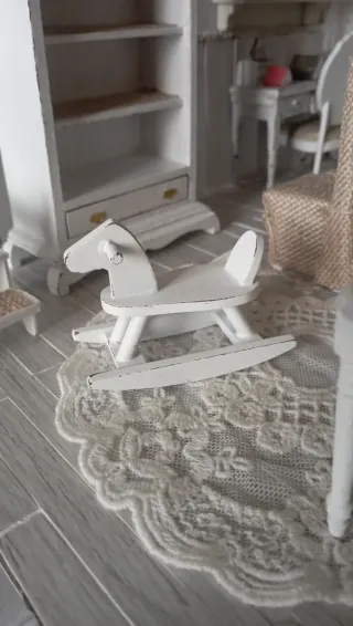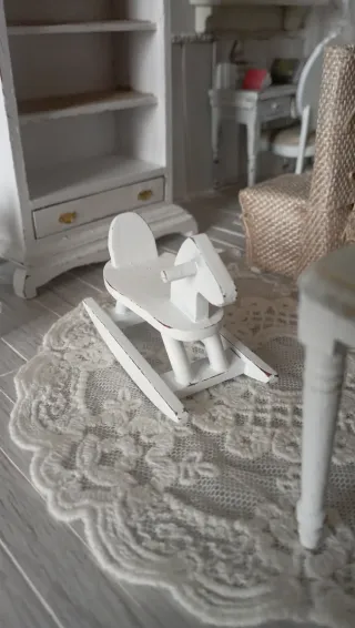Incantevole cavallo a dondolo in miniatura (scala 1:12) in stile Shabby Chic. Realizzato in legno bianco con finitura decapata effetto vintage. Un accessorio decorativo pieno di fascino, perfetto per la camera dei bambini o un angolo nostalgico del salotto della tua casa delle bambole. Design classico e senza tempo, fatto a mano con grande attenzione ai dettagli. Un piccolo gioiello per collezionisti che amano lo stile provenzale e romantico. (Vedi il mio profilo per altri mobili coordinati). #dollhouse #miniaturas #shabbychic #caballo #miniature112 #vintage #handmade #hechoamano #casadellebambole #decoracion #juguetesmini