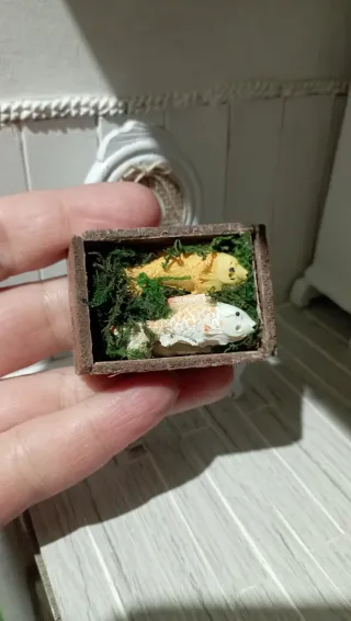 Porta il realismo del mercato nella tua casa delle bambole! 🐟 Vendo una dettagliata cassetta di pesci in miniatura in scala 1:12, perfetta per un banco del mercato, una cucina o una scena all'aperto. Dettagli: La cassetta in legno contiene due grandi pesci (uno dorato e uno bianco) adagiati su un letto di muschio verde fresco. Artigianalità: Ogni pesce è rifinito con squame e dettagli realistici. Scala: 1:12, ideale per diorami e collezionisti. Stato: Nuovo, curato nei minimi particolari per un effetto scenico eccellente. Un accessorio unico e originale per i tuoi piccoli mondi! ✨ #dollhouse #miniatura #miniature #pesce #fish #doll