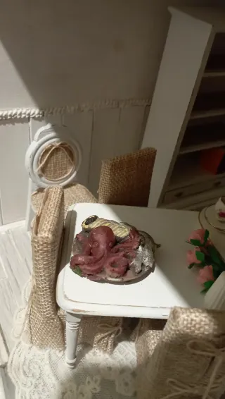 Servi una cena gourmet nella tua casa delle bambole! 🍱 Vendo raffinato piatto di pesce pronto da servire, realizzato con incredibile cura dei dettagli in scala 1:12. Composizione: Polipo intero, acciughe ecc. . Dettagli: Rifinito con colori ultra-realistici. Scala: 1:12, perfetto per la tavola della sala da pranzo o della cucina. Stato: Ottime, un vero tocco di classe per collezionisti e diorami. Un accessorio culinario delizioso per arricchire la tua collezione! ✨ #dollhouse #miniatura #miniature #fish #foodminiature #dollhouseminiatures #scala112 #collezionismo #piattominiatura #casadellebambole #cucinaminiatura