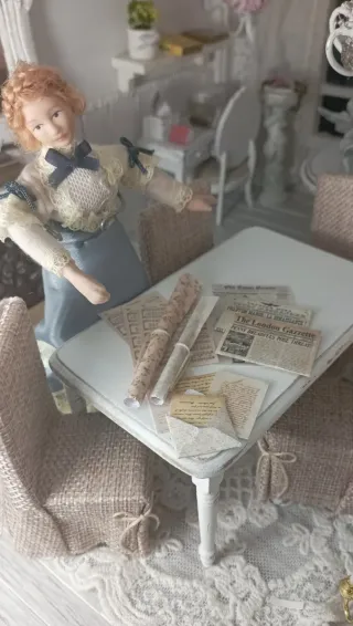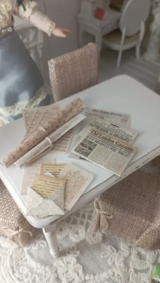 Elegante set di miniature in stile vittoriano per case delle bambole (scala 1:12). Include giornali d'epoca, lettere manoscritte con buste floreali, spartiti e pergamene. Dettagli incredibili per un tocco di realismo storico. Ottime condizioni. Elegante set de miniaturas de estilo victoriano para casas de muñecas (escala 1:12). Incluye periódicos de época, cartas manuscritas con sobres florales, partituras y pergaminos. Detalles increíbles para un toque de realismo histórico. Excelente estado. #Miniature #Vittoriano #Dollhouse #Miniaturas #Victoriano #CasasDeMuñecas #Vintage #Coleccionismo #MiniatureArt #Diorama #Atrezzo