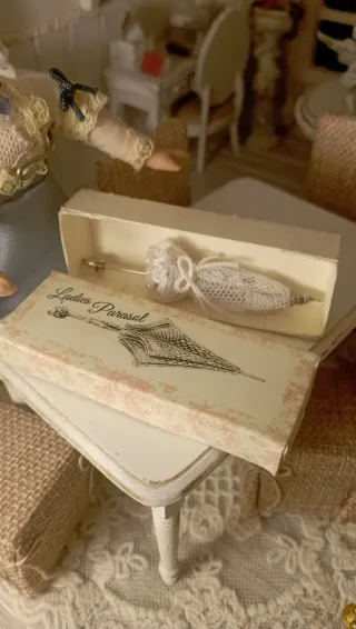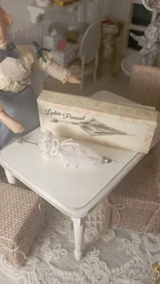 Splendida miniatura di ombrellino da sole vittoriano in pizzo bianco con scatola decorata "Ladies Parasol". Accessorio raffinato per case delle bambole in scala 1:12. Dettagli metallici e finiture artigianali di pregio. Preciosa miniatura de sombrilla victoriana de encaje blanco con caja decorada. Accesorio elegante para casas de muñecas (escala 1:12). Detalles metálicos y acabados artesanales de alta calidad. #miniature #vittoriano #dollhouse #miniaturas #victoriano #casasdemuñecas #vintage #coleccionismo #parasol #sombrilla #diorama #artesania
