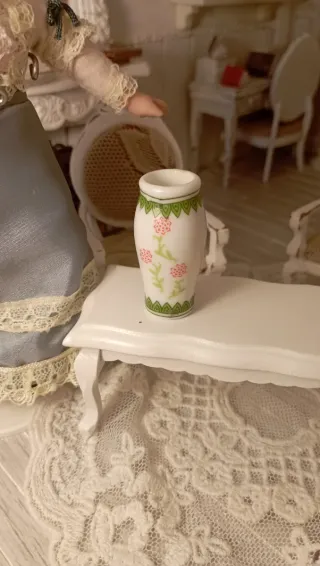 Raffinato vaso in ceramica/porcellana per casa delle bambole, scala 1:12. Decorato con un delicato motivo floreale rosa e bordini verdi, ideale per ambientazioni vittoriane o shabby chic. Perfetto per completare salotti, camere da letto o tavolini. Realizzato con cura e finitura lucida, dona un tocco di eleganza a ogni diorama. In ottime condizioni, come da foto. (Si vende solo il vaso, mobili e bambole in foto esclusi). Hashtag: #dollhouse #miniature #112scale #casadellebambole #casademuñecas #miniaturas #collezionismo #vasominiatura #shabbychic #decoracionminiaturas #modellismo
