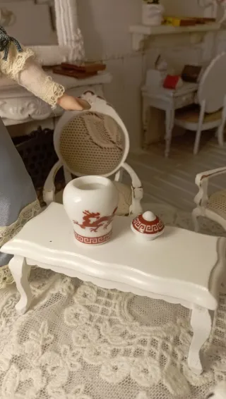 Raffinato vaso in miniatura con coperchio rimovibile per casa delle bambole (scala 1:12). Bellissima decorazione con draghi rossi in stile orientale, ideale per arricchire salotti vittoriani o studi eleganti. Composto da due pezzi in porcellana/ceramica lucida. Un accessorio di alta qualità per collezionisti e amanti del dettaglio. In perfette condizioni, come da foto. (Si vende solo il vaso con coperchio, altri mobili o bambole esclusi). #dollhouse #miniature #112scale #casadellebambole #casademuñecas #miniaturas #collezionismo #vasominiatura #porcellana #decoracionminiaturas #oriental