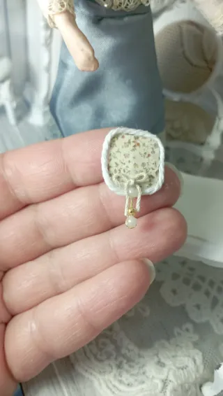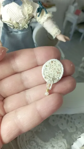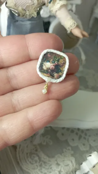 Elegante ventaglio fisso (handscreen) in miniatura per casa delle bambole, scala standard 1:12. Realizzato a mano con estrema cura per i dettagli: forma ovale, fantasia floreale delicata, bordo in passamaneria e charm di perline. Perfetto per completare scene vittoriane o arredare camere da letto in miniatura. Un pezzo unico per collezionisti esigenti che cercano alta qualità artigianale. #miniaturas #casademuñecas #escala112 #dollhouse #hechoamano #artesania #victoriandollhouse #coleccionismo #fattoamano #vittoriano #miniatureitaliane