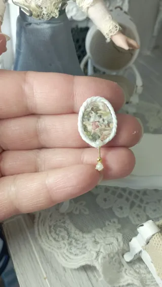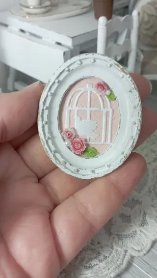 Elegante quadretto ovale in miniatura per casa delle bambole (scala 1:12). Cornice bianca decorata a mano con effetto decapato e dettagli oro. L'interno presenta un motivo romantico con gabbietta, uccellino e roselline in rilievo su fondo rosa pastello. Un oggetto d'arte artigianale unico, ideale per decorare pareti in stile shabby o provenzale. Perfetto per collezionisti, curato in ogni minimo dettaglio per un effetto realistico e sognante. #dollhouse #miniature #shabbychic #112scale #casedellebambole #miniaturas #mueblesmuñecas #miniaturdollhouse #casademuñecas #handmade Hai degli altri splendidi arredi o accessori di cui vorresti