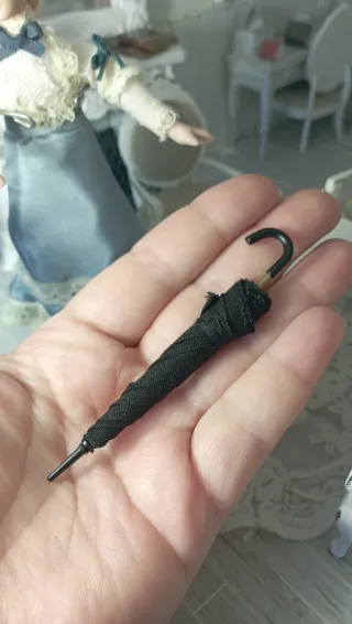 Raffinato ombrello da uomo in miniatura, scala 1:12, perfetto per case delle bambole o diorami storici. Modello chiuso con tessuto nero texturizzato, manico curvo classico e dettagli di alta precisione. Realizzato artigianalmente, è l'accessorio ideale per completare l'arredo di un ingresso o lo studio di un gentiluomo dell'Ottocento. Robusto, elegante e proporzionato con cura. #miniaturas #escala112 #dollhouse #paraguasminiatura #victorian #coleccionismo #casademuñecas #gentleman #hechoamano #fattoamano #vittoriano #miniatureitaliane