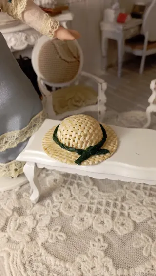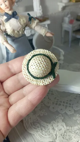 Grazioso cappellino estivo in stile vittoriano per casa delle bambole, scala 1:12. Realizzato a mano con intreccio effetto paglia e decorato con nastro verde scuro. Ideale per completare l'abbigliamento di bambole in porcellana o per arricchire scenari all'aperto, giardini e picnic in miniatura. Leggero, dettagliato e perfettamente proporzionato. Un tocco romantico essenziale per ogni collezionista. #miniaturas #casademuñecas #escala112 #sombrerominiatura #victorianstyle #hechoamano #fattoamano #dollhouse #coleccionismo #artesanía #vittoriano