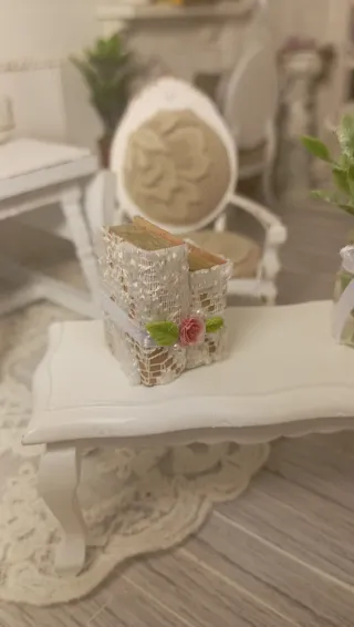 Splendido porta riviste artigianale per casa delle bambole in scala 1:12. Realizzato e decorato a mano con motivi floreali (rose) e quotidiani in miniatura inclusi. Stile Shabby Chic/Romantico, perfetto per arredare salotti o angoli lettura Dollhouse. Pezzo unico (OOAK) curato nei dettagli, colore bianco panna. Un accessorio indispensabile per collezionisti che cercano realismo e design esclusivo. In ottime condizioni.