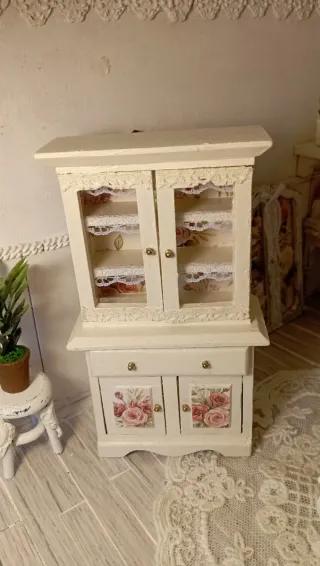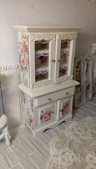 Incantevole credenza in miniatura (scala 1:12) in stile Shabby Chic. Questo mobile romantico presenta decorazioni floreali con rose, delicati inserti in pizzo e pomelli dorati. Totalmente funzionale: le ante della vetrina, il cassetto e gli sportelli inferiori si aprono realmente. Interno foderato con carta decorata coordinata. Un pezzo unico e ricco di fascino per impreziosire la tua casa delle bambole o la tua collezione. Perfette condizioni, rifiniture artigianali.