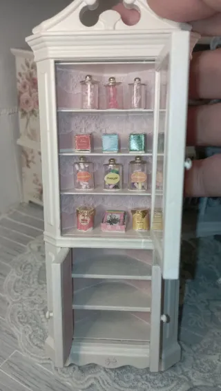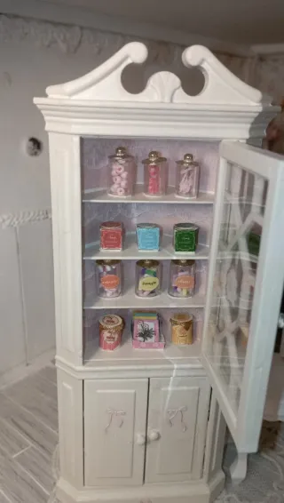 Lasciati rapire dalla dolcezza di questa vetrina angolare in miniatura. Un pezzo unico dipinto a mano, decorato con pizzo candido e minuscoli fiocchi rosa. Al suo interno custodisce un magico mondo di piccoli dolci e caramelle colorate, tutti realizzati artigianalmente. Le ante si aprono per svelare ogni piccolo dettaglio curato con amore. Ideale per chi vuole regalare un tocco di eleganza e nostalgia alla propria casa delle bambole. Un sogno in scala 1:12 che aspetta solo di essere esposto. #miniature #dollhouse #shabbychic #fattoamano #collezionismo