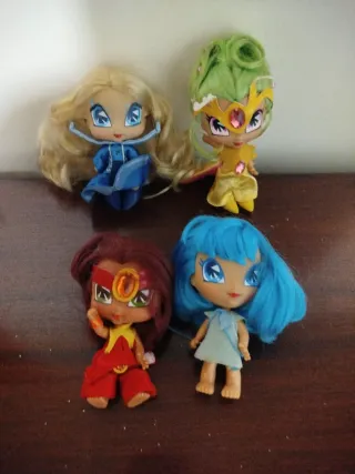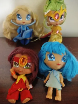 Set di 4 bambole Winx Pixies. - Bambola con capelli biondi e vestito blu. - Bambola con capelli verdi, corona e vestito giallo. - Bambola con capelli castani, fascia rossa e tuta rossa. - Bambola con capelli blu e vestito azzurro.