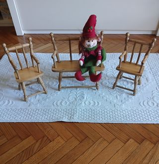 🪑🪑Set di mobili in legno per casa delle bambole o per creare un piccolo salotto in miniatura. -->bambola ESCLUSA <-- - altezza cm 29, larghezza sedia cm 15, larghezza divano cm 30, profondità cm 9 - Realizzato in legno chiaro. - Include un divanetto e due poltroncine. - Design classico con schienale a listelli e braccioli.