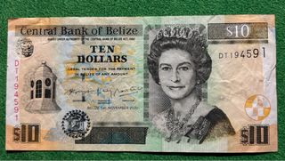 Banconota da 10 dollari del Belize, con ritratto della Regina Elisabetta II. - Emessa dalla Central Bank of Belize. - Valida come corso legale in Belize. - Data di emissione: 1° novembre 2020.