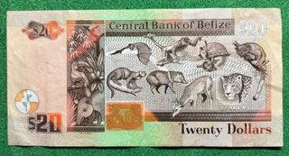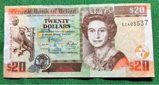 Banconota da 20 dollari del Belize, emessa dalla Central Bank of Belize. - Valuta legale per pagamenti in Belize. - Data di emissione: 1° settembre 2022. - Raffigura la Regina Elisabetta II. - Presenta un giaguaro e pesci tropicali.
