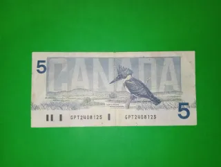 In vendita banconota da 5 Dollari Canadesi, emissione 1986, serie "Birds of Canada". Un pezzo da collezione molto suggestivo, caratterizzato dal colore blu e dalle splendide illustrazioni tipiche di questa serie. Paese: Canada Valore: 5 Dollari Anno: 1986 Fronte: Ritratto di Sir Wilfrid Laurier (settimo Primo Ministro del Canada) Retro: Raffigurazione di un Martin Pescatore americano (Belted Kingfisher) appollaiato su un ramo Numero di Serie: GPT 2408125 Firme: Bonin-Thiessen Stato di conservazione: BB (Bellissima). La banconota è circolata e presenta una piega centrale verticale molto marcata, piccoli segni di sporco e legg