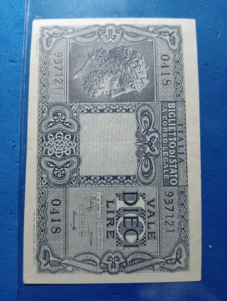 Biglietto di Stato da 10 Lire, periodo Luogotenenza. - 1944 10 lire Giove in conservazione FDS fior di stampa vedi foto e catalogo Gigante. - Numero di serie: 937121 - Codice: 0418 - Italia - Biglietto di Stato a corso legale - Vale Dieci Lire - Firma del Direttore Generale del Tesoro e del Cassiere Speciali - Visto per la Corte dei Conti