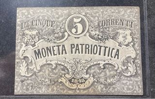 Venezia 5 lire correnti moneta patriottica 1848 GOVERNO PROVVISORIO - Banconota. Taglio 5 lire correnti TIPO Moneta Patriottica - Venezia Sul retro è presente timbro rosso tondo, raffigurante il Leone di Venezia. EMISSIONE 1848 FIRME Assenti TIRATURA (migliaia) 656,4 RARITÀ C RIFERIMENTO CATALOGO La Cartamoneta Italiana - Crapanzano Giulianini - Vol. II - Pag. 171 - Nº MP4