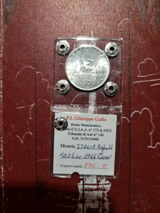 Moneta da 500 Lire in argento del 1966, coniata dalla Repubblica Italiana. La moneta è stata periziata. - Anno: 1966 - Valore: 500 Lire - Materiale: Argento - Conservazione: FDC (Fior di Conio) - Perizia inclusa