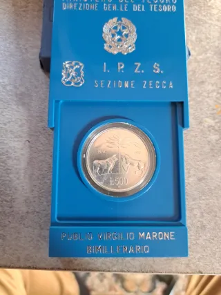 Moneta in argento da 500 Lire, coniata nel 1981, dedicata a Publio Virgilio Marone per il bimillenario. - Diritto: Ritratto di Virgilio. - Rovescio: Scena allegorica con la Lupa Capitolina e il bimillenario di Virgilio. - Zecca: IPZS Sezione Zecca. - Metallo: Argento.