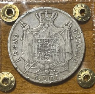 Moneta da 5 Lire del Regno d'Italia, con l'effigie di Napoleone Bonaparte. Caratteristiche Ente emittente Napoleonic Kingdom of Italy (Italian States) Re Napoleon I (1805-1814) Tipo Moneta di circolazione regolare Anni 1807-1814 Valore 5 Lire Valuta Lira (1807-1814) Composizione Argento 900‰ Peso 25 g Diametro 37 mm Spessore 2.46 mm Forma Rotonda Tecnica Fresato Orientamento Allineamento come moneta ↑↓ Demonetizzato Sì Numero N#13400 Referenze MIR MI# 480, KM# 10