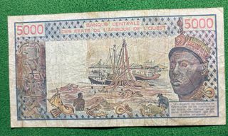 Banconota della Banque Centrale des États de l'Afrique de l'Ouest. 3 buchi di spillo - Valore: 5000. - Design con scena portuale e ritratto. - Scritta BANQUE CENTRALE DES ETATS DE L'AFRIQUE DE L'OUEST.