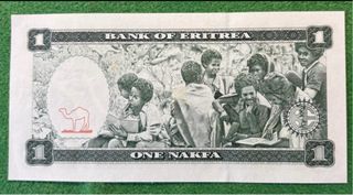 Banconota da 1 Nakfa dello Stato dell'Eritrea, emessa nel 1997. - Diritto di corso legale in Eritrea. - Serie AC, numero di serie 0697500. - Raffigura tre volti e un cammello. - Data di emissione: 24.5.1997.