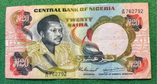 Banconote della Nigeria con valore da 20 Naira. - Raffigura il Generale Murtala R. Muhammed. - CENTRAL BANK OF NIGERIA stampato in alto. - Valore 20 NAIRA ben visibile.
