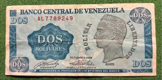 Banconote della Banca Centrale del Venezuela. - Valore: 2 Bolivares - Data: Ottobre 5, 1989 - Serie: AL7789249 - Dettaglio: Ritratto di Simón Bolívar