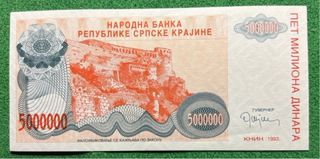 Banconota da 5 milioni di dinari della Repubblica Serba di Krajina, emessa nel 1993. - Valore: 5.000.000 Dinara - Emittente: Narodna Banka Republike Srpske Krajine - Anno: 1993 - Luogo di emissione: Knin - Serie: A - Numero di serie: 0251315