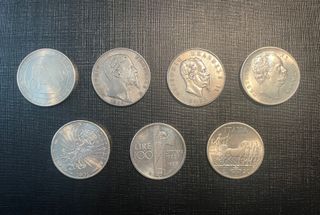 Lotto di 7 monete in argento raffiguranti i Reali di Savoia. Riproduzione fedele, molto curata degli anni 70-80. Tot. grammi 159. Diametro medio cm 3,5. Spessore medio mm 2. 1848- Repubblica Veneta 5 lire (g. 24) 1859- Vittorio Emanuele II 5 lire (g. 23) 1873- Vittorio Emanuele II 5 lire (g. 23) 1878- Umberto I 5 lire (g. 23) 1901- Vittorio Emanuele III 5 lire (g. 24) 1922-23- Vittorio Emanuele III 100 lire (g. 21) 1936- Vittorio Emanuele III Imperatore 20 lire (g. 21)