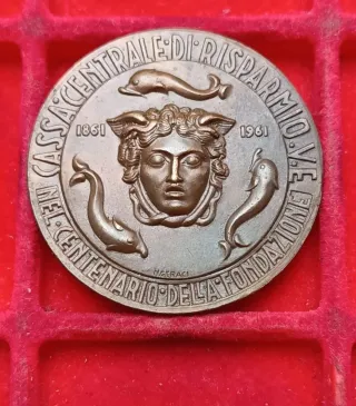 Medaglia in Bronzo Centenario Fondazione Cassa Centrale di Risparmio V.E. Autore Nino Geraci. Medaglia in bronzo celebrativa del centenario della fondazione della Cassa di Risparmio. - Raffigura Medusa e delfini. - Anni 1861-1961. - Firma N. Geraci.
